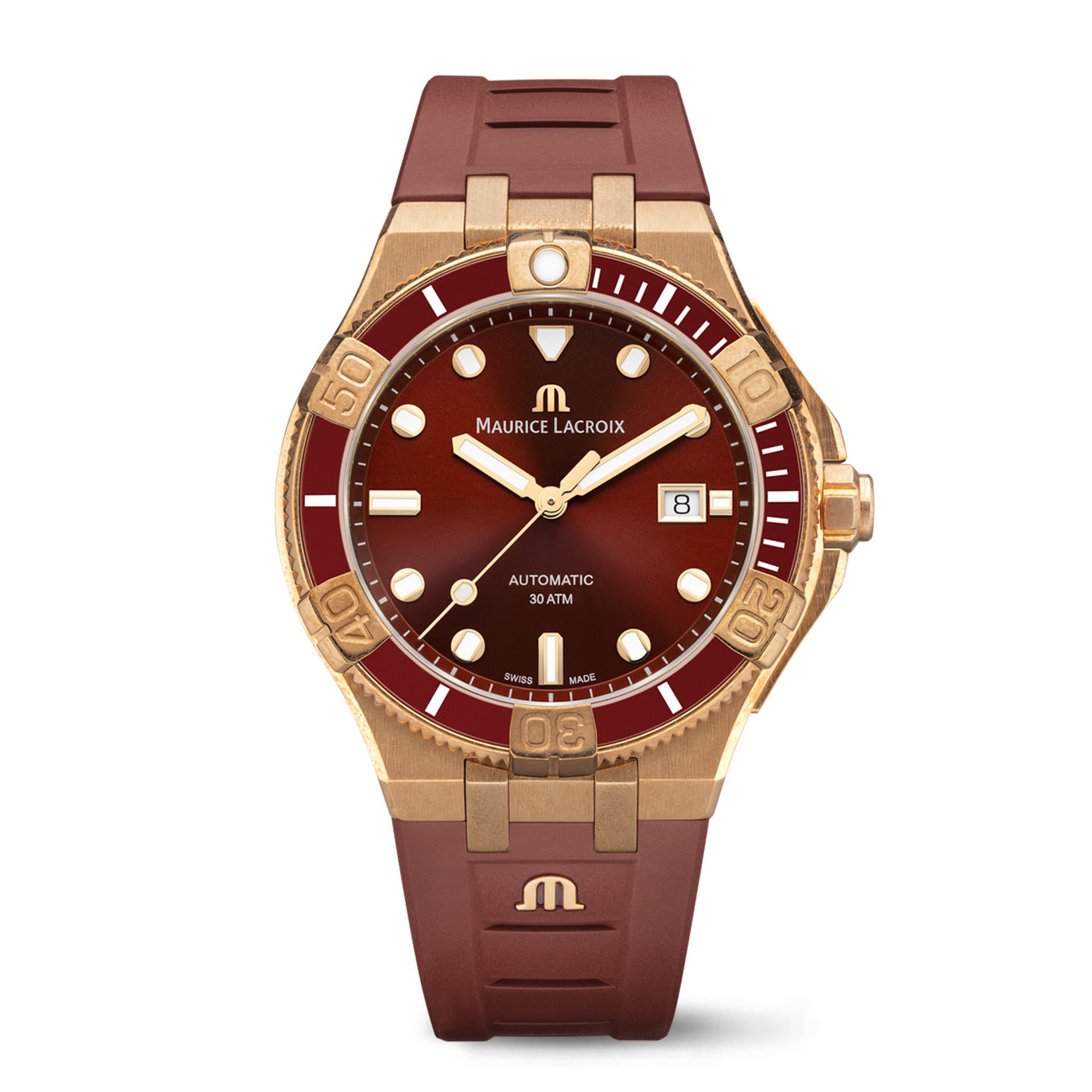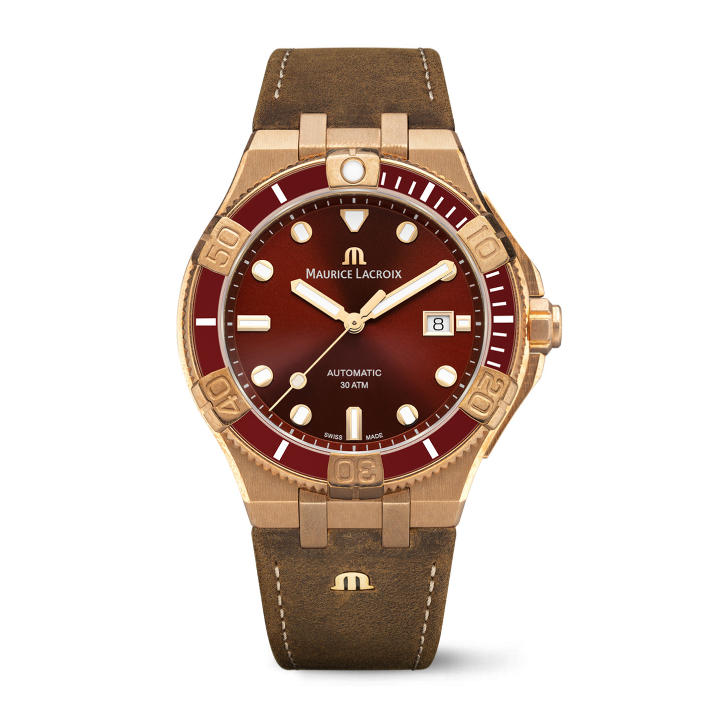 - BRACELET/STRAP: Brown, leather strap, featuring the Maurice Lacroix 'm' logo