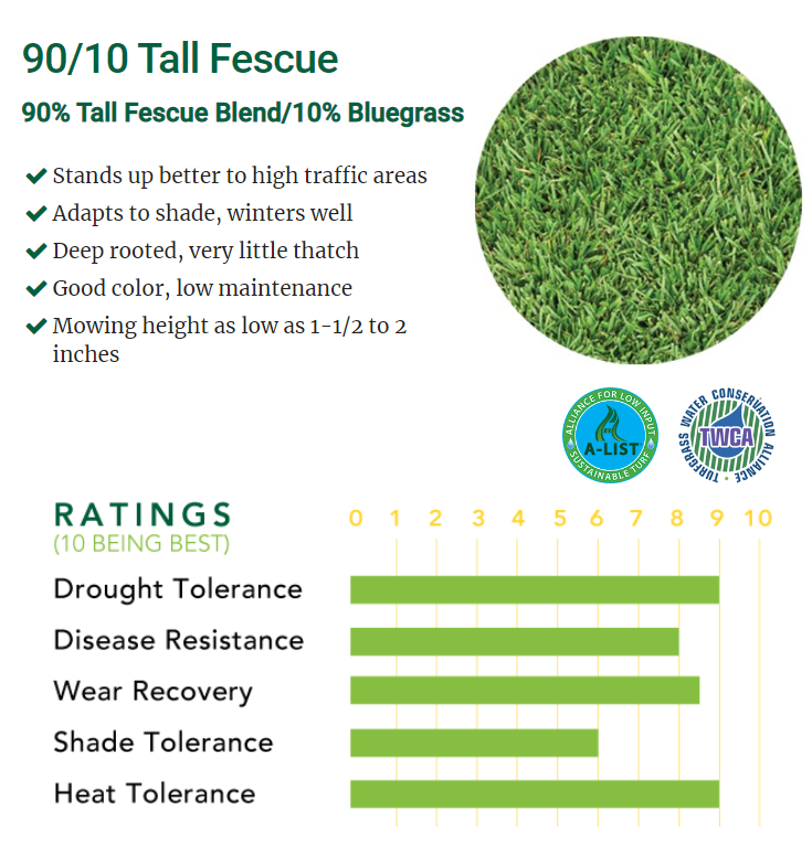 The 9010 Tall Fescue grass seed mix is 90% Tall Fescue grass seed and 10% Kentucky Bluegrass seed. The Tall Fescue grass seed is our #1 Best Selling grass seed due to its many desirable traits, such as its ability to withstand high foot traffic, great wear and tear recovery, and traffic tolerance to dogs. Tall fescue grass seed has a deep rooting system helping with drought tolerance and disease resistance for your lawn. Tall Fescue grass seed can be in full sun areas and adapts to shade as well. Tall fescue grass is a bright green color even in winter, providing a beautiful green lawn year-round.